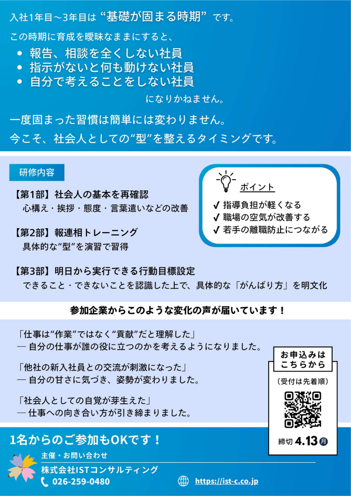 この研修では、若手社員がつまずきやすい「社会人の基本マナー」「報連相」「仕事の目標の立て方」を整理し、